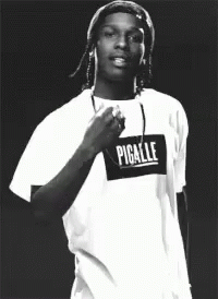 A$AP Rocky in a white Pigalle t-shirt, making a gesture with his hand to his mouth in a black and white shot.