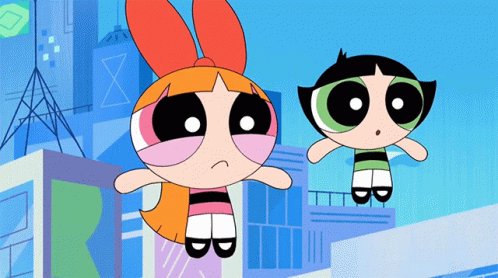 Blossom and Buttercup from The Powerpuff Girls appear nauseous and about to throw up while flying.