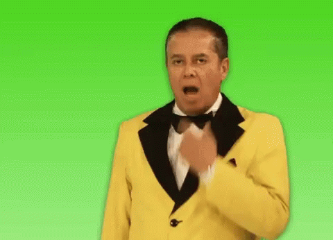 Mario Bezares, in a yellow tuxedo, makes a disgusted face, reacting with 'asco' (disgust).
