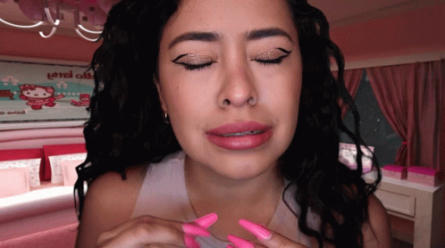 Merith Aranda Asmr shows a disgusted 'asco' reaction, with a Hello Kitty poster in her pink-themed room.