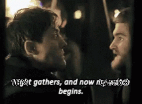 Two men engage in a tense conversation in a dimly lit setting, with a caption about a gathering and a new week.
