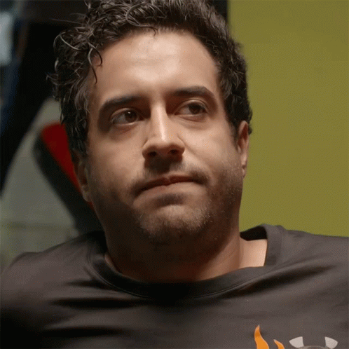 Man with curly hair and beard, wearing a black shirt, looking around with a thoughtful expression.