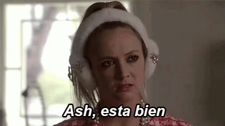 A woman wearing earmuffs says 'Ash, esta bien' (Ash, it's okay) in Spanish.