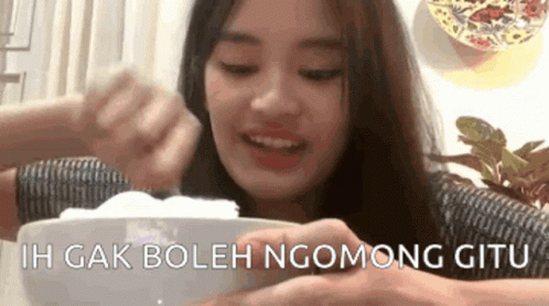 Ashel JKT48 eating from a bowl, smiling, with the Indonesian caption 'IH GAK BOLEH NGOMONG GITU' visible.