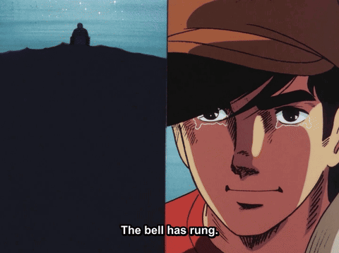A poignant scene from Ashita No Joe featuring Joe Yabuki and Carlos Rivera, with the bell ringing and 'To be continued'.