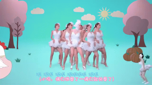A humorous animated video featuring people in chicken, dog, and sheep masks dancing in a cartoon landscape.