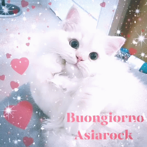 An adorable fluffy white cat with big eyes, surrounded by sparkles and hearts, wishing 'Buongiorno Asiarock'.