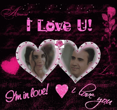 A romantic graphic featuring two people, possibly Burcu Kiratli and Emrah, in heart frames with 'I Love U!' text.
