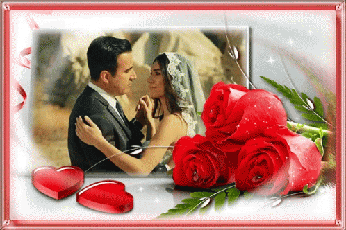 Emrah and Burcu from Ask Ve Mavi celebrate their wedding, captured in romantic moments with roses and hearts.