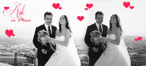 Emrah and Burcu from Aşk ve Mavi celebrate their wedding, with the bride throwing her bouquet in a joyful moment.