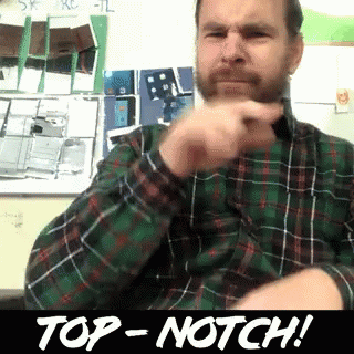 Man in plaid shirt demonstrates the ASL sign for 'Top-Notch' with a clear hand gesture.