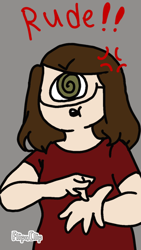 Animated cartoon character with a hypnotic eye and angry expression, with the word 'Rude!!' displayed.