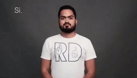 A man demonstrates 'Yes' in American Sign Language, wearing an 'RD' shirt.