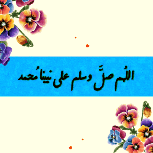 Animated image featuring the Arabic prayer 'O Allah, send prayers and peace upon our Prophet Muhammad', with flowers and hearts.