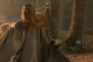 Aslan the lion playfully interacts with a person in a forest from The Lion, The Witch, and The Wardrobe.