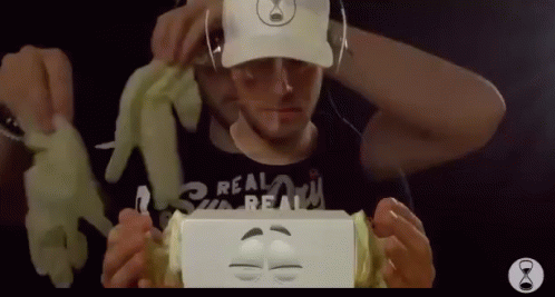 A person wearing headphones and a cap performs ASMR with light green gloves, shuffling them over a white box.