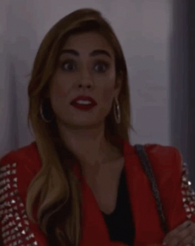 Charleimy, also known as Lareinadelflow, shows surprise then a thoughtful expression in her red studded jacket.