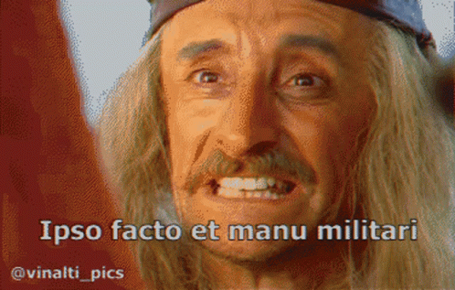 An Asterix pirate character quoting 'Ipso facto et manu militari', a Latin phrase meaning 'by military force'.