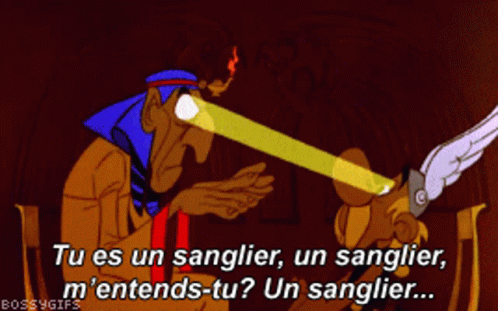 A character from Astérix shouts 'Tu es un sanglier!' (You are a wild boar!) with intense, glowing eyes.