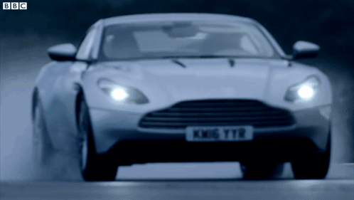 A sleek silver Aston Martin DB11 sports car drives on a wet road, showcasing its performance.
