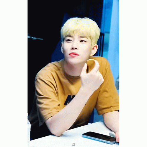 Astro MJ (Kim Myung Jun) with blonde hair, sitting at a table, holding a cookie and a phone.