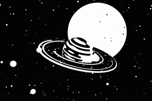 A black and white animated planet with prominent rings rotates in the vastness of space, surrounded by stars.