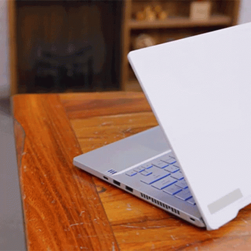Asus Rog Zephyrus G14 laptop open on a wooden table, showcasing its sleek design and backlit keyboard.