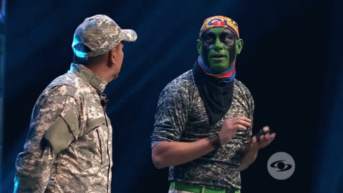Soldado Micolta from Sabados Felices looks scared on stage, with green face paint and camouflage.