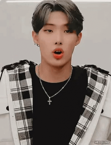 Ateez member Mingi makes a funny and cute face while wearing a black shirt and plaid jacket.