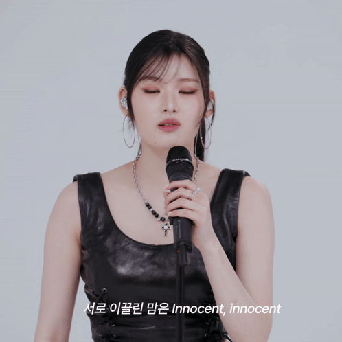 Athena Fifty Fifty performs live, singing into a microphone with the caption 'Innocent, innocent'.