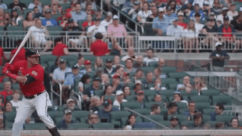 Atlanta Braves player Austin Riley hits the ball and runs the bases during a baseball game.