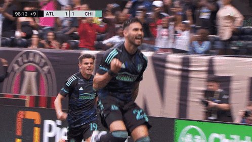 Juan Jose Purata celebrates his goal for Atlanta United FC against Chicago, with teammates Rossetto and Lentham.