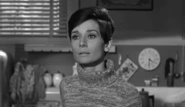 Audrey Hepburn playfully sticking her tongue out in a black and white scene, wearing a cozy turtleneck sweater.