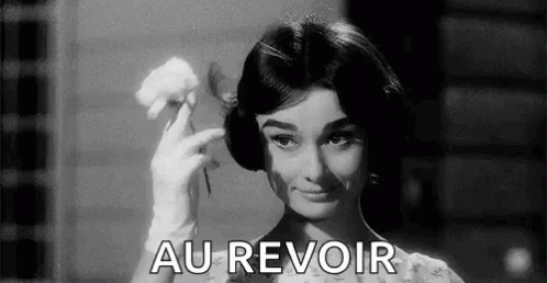 Audrey Hepburn waves goodbye with a flower, with "AU REVOIR" text overlay.