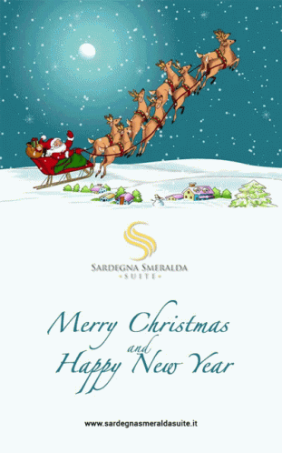 A festive Christmas and New Year card featuring Santa Claus, his sleigh, and reindeer flying over a snowy village.