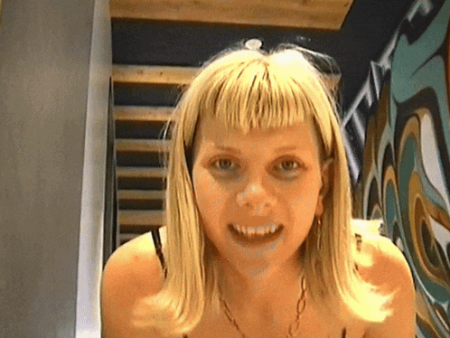 a woman with blonde hair is smiling in front of a wall with graffiti