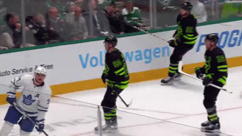 Auston Matthews of the Toronto Maple Leafs reacts on the ice during a hockey game, raising his hands in frustration or appeal.