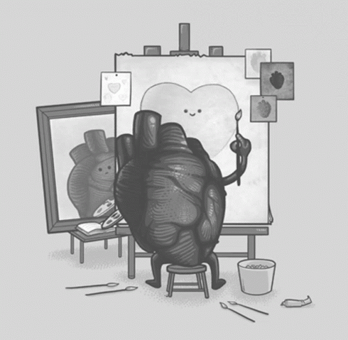 A creative black and white illustration of an anatomical heart painting a cute, cartoon-like heart.