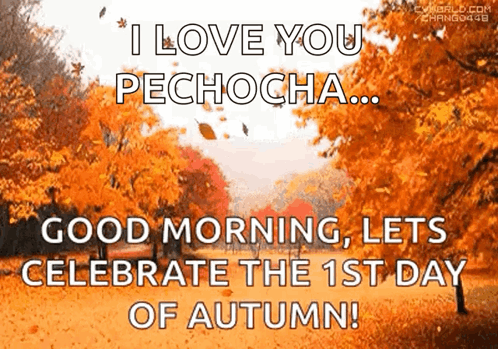 Good morning message with falling autumn leaves, celebrating the first day of autumn for Pechocha.