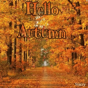 A vibrant greeting card featuring an autumn forest path and the text 'Hello Autumn'.
