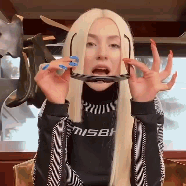 Ava Max, with long blonde hair, stylishly puts on her sunglasses, showcasing her unique fashion and vibrant nails.