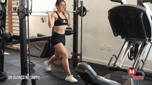 Woman performing lunges on a Smith machine as part of a leg and glute workout, presented by Treino Mestre.
