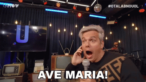 Otaviano Costa dramatically exclaims 'Ave Maria!' while holding a microphone on stage.