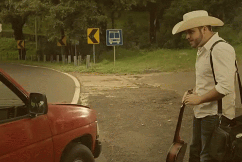 Gerardo Ortiz, a singer, waits by the road with his guitar, looking for a ride.