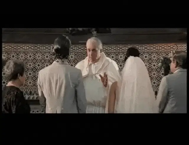 Bad Bunny performing live in a brown embellished shirt, surrounded by cheering people at a vibrant party.