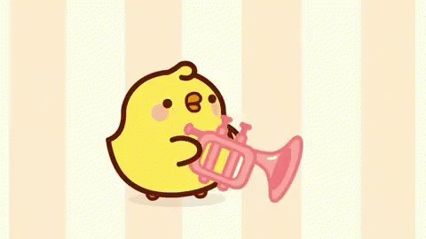 Piu Piu, the adorable chick from Molang, plays a cheerful tune on a pink trumpet.