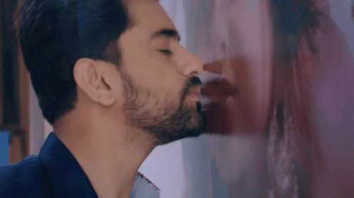 Avneil Adiza: A man with a beard kisses an image or reflection, then looks around with a surprised expression.