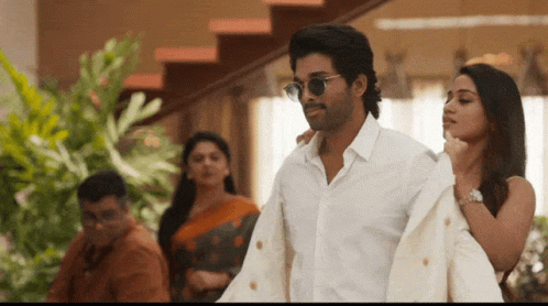 Allu Arjun, the Stylish Star, walks confidently in a white suit and sunglasses, assisted by a woman in a modern home.
