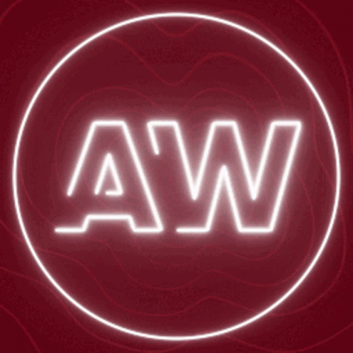 Dynamic animation of a glowing neon 'AW' logo on a vibrant red background with abstract patterns.