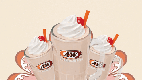 Three delicious A&W Apple Pie Shakes topped with whipped cream and cherries, a perfect fast food treat.